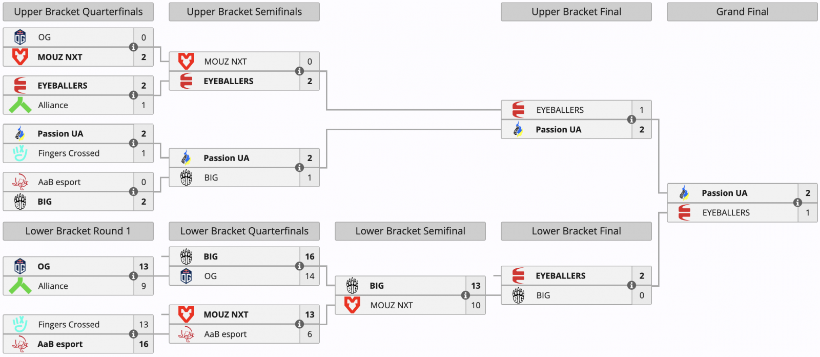 На пути в заключительный раунд турнирной сетки Passion UA также расправилась с такими соперниками, как BIG и Fingers Crossed, и одолела EYEBALLES в финале виннеров.