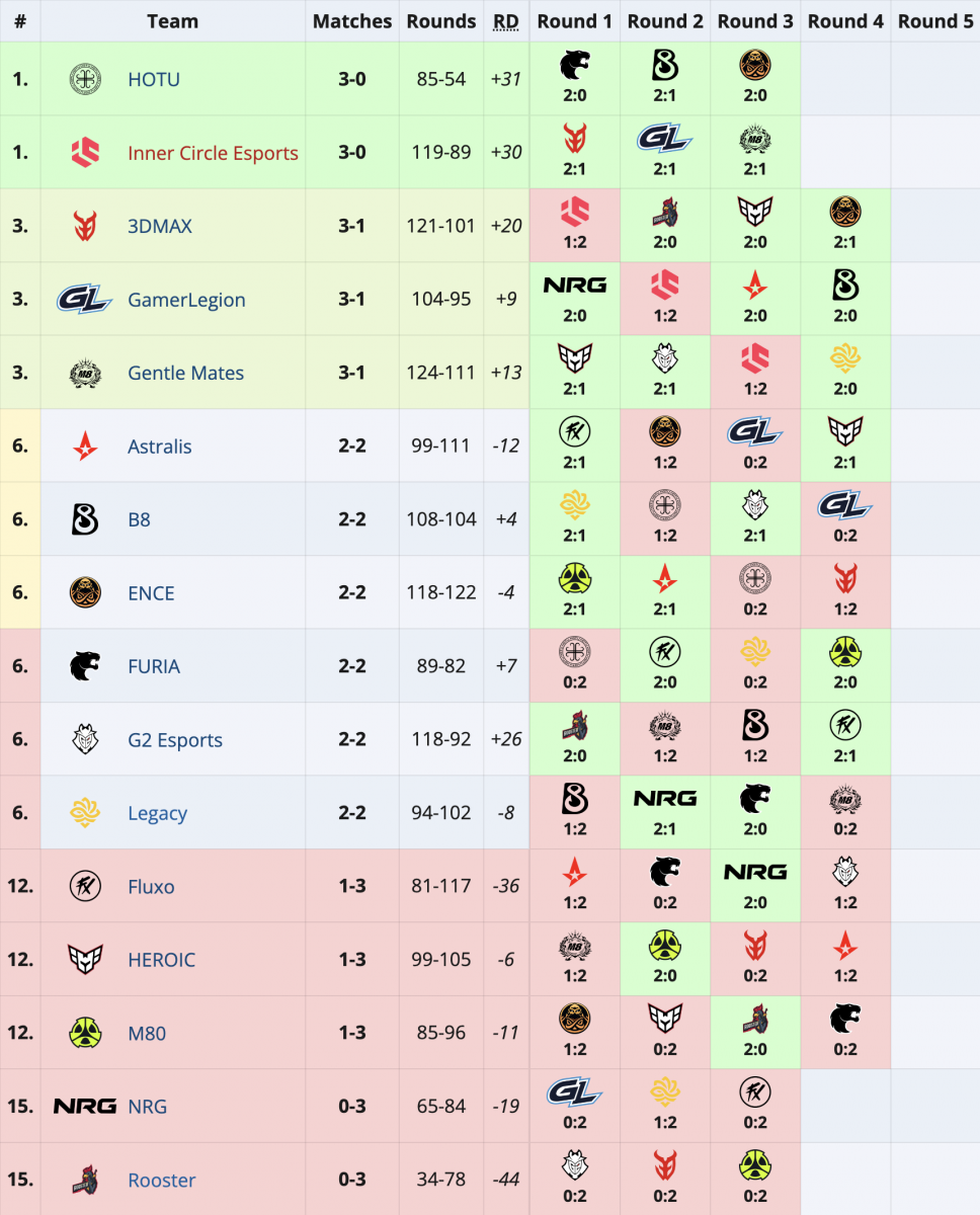 Кроме того, еще три команды сегодня завершили свое выступление на турнире: в четвертом раунде "швейцарки" Fluxo уступила G2, HEROIC не справилась с Astralis, а M80 потерпела поражение от FURIA. Все три команды финишировали чемпионат со статистикой 1-3.