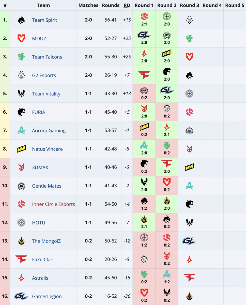 В результате четыре коллектива (Falcons, MOUZ, Team Spirit, G2) финишировали второй день второй стадии турнира со статистикой 2:0 по матчам. Напротив, The MongolZ, FaZe, GamerLegion и Astralis пока не удалось выиграть ни одной встречи. Остальные команды сейчас имеют по одной победе и одному поражению в своем активе.