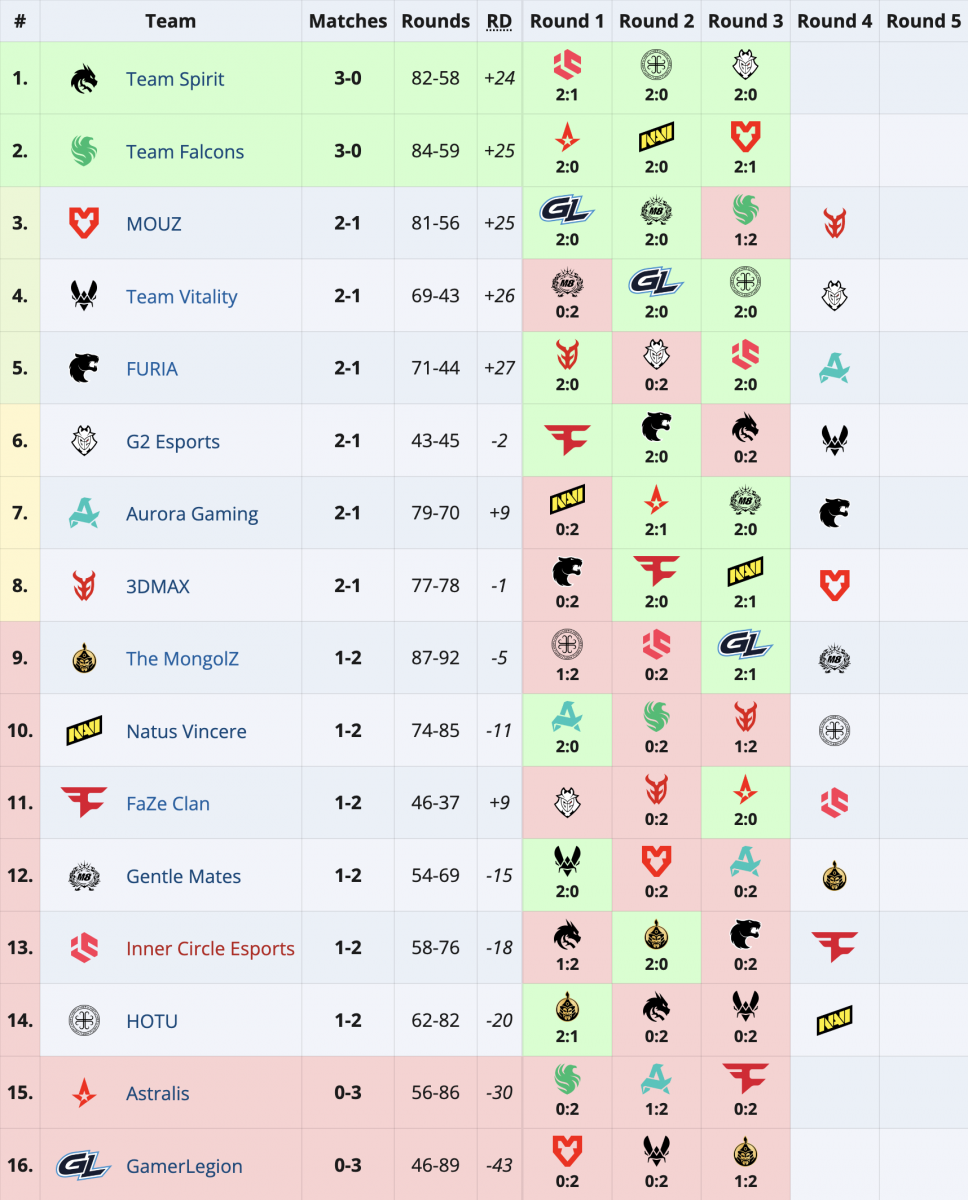 Победителями из сегодняшних противостояний вышли Falcons, Team Spirit, Vitality, Aurora, 3DMAX, FURIA, The MongolZ и FaZe – им удалось обыграть MOUZ, G2, HOTU, Gentle Mates, NAVI, Inner Circle, GamerLegion и Astralis соответственно.