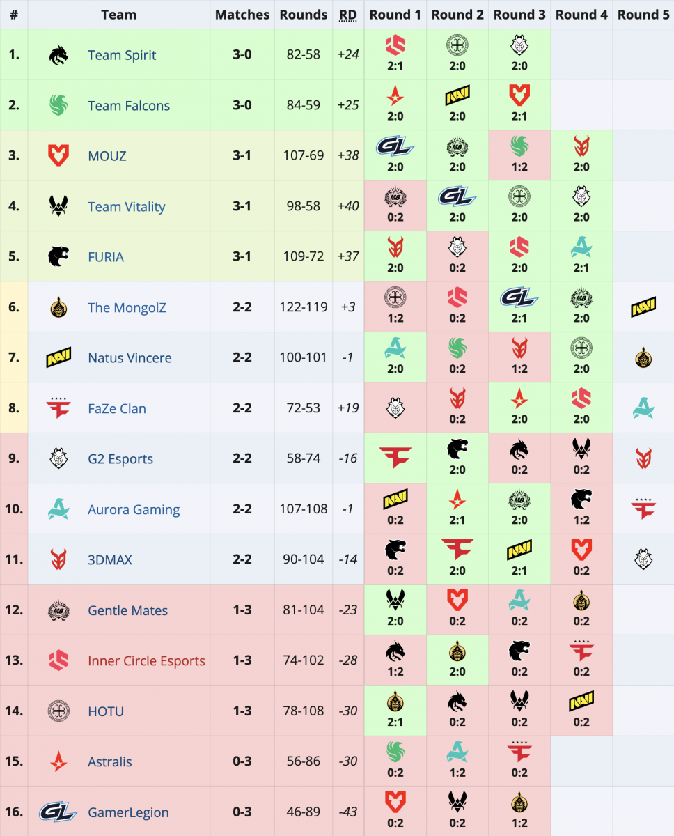 Кроме того, еще три команды сегодня завершили свое выступление на турнире: в четвертом раунде "швейцарки" HOTU уступила NAVI, Gentle Mates не справилась с The MongolZ, а Inner Circle потерпела поражение от FaZe. Все три команды финишировали чемпионат со статистикой 1-3.
