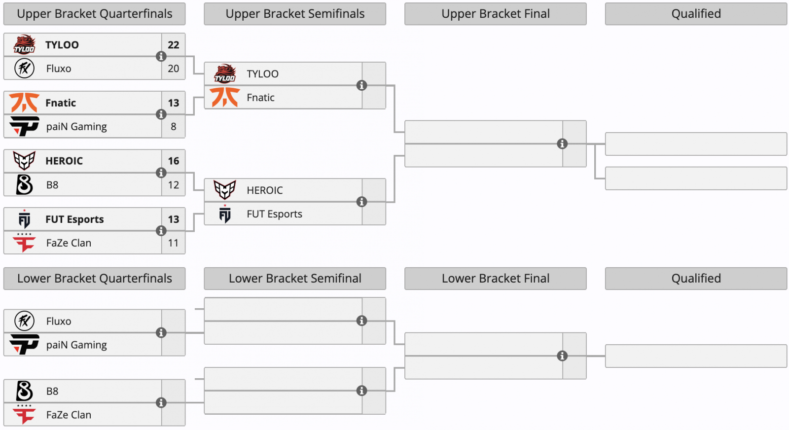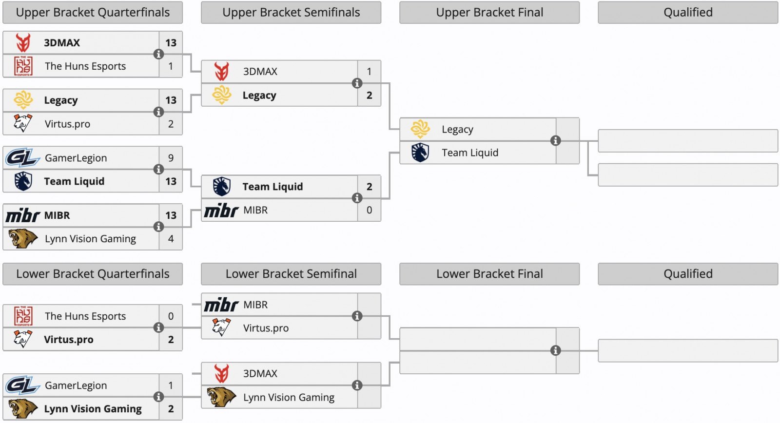 Кроме того, четыре команды сегодня завершили свое выступление на турнире: в первом раунде нижней сетки группы A The Huns уступила Virtus.pro, а GamerLegion потерпела поражение от Lynn Vision.