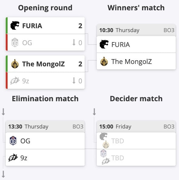 Бразильский коллектив одолел OG, а монголы расправились с 9z. Обе встречи завершились со счетом 2:0. Проигравшие упали в нижнюю сетку, а победители завтра поборются друг с другом за выход в плей-офф.