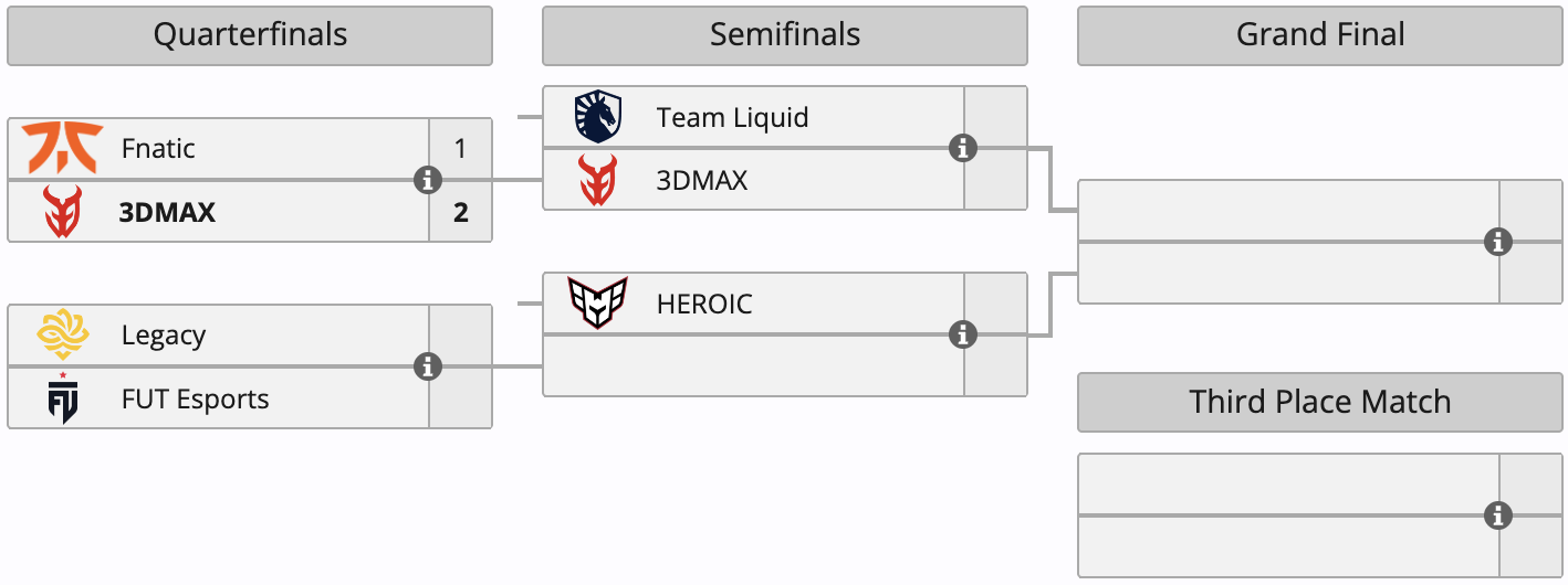 В первом раунде плей-офф 3DMAX со счетом 2:1 обыграла состав fnatic (13:5 на Inferno, 7:13 на Train, 13:9 на Dust2). fnatic заняла 5-6 место на турнире и заработала $20 тысяч призовых. Французы, в свою очередь, прошли в следующий раунд сетки, где завтра встретятся с Liquid в матче за выход в финал.