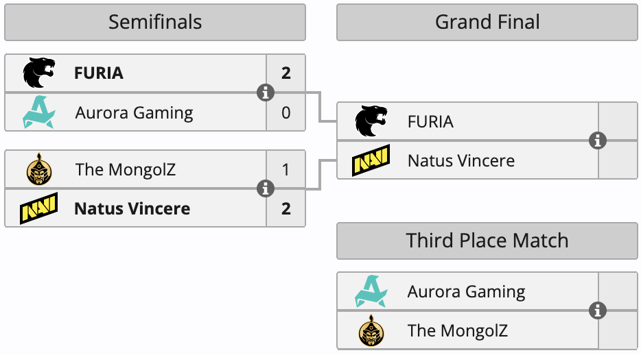 В первом раунде турнирной сетки FURIA одержала победу над Aurora (13:11 на Train, 13:5 на Overpass), а NAVI расправилась с The MongolZ (13:9 на Mirage, 3:13 на Nuke, 13:10 на Ancient).