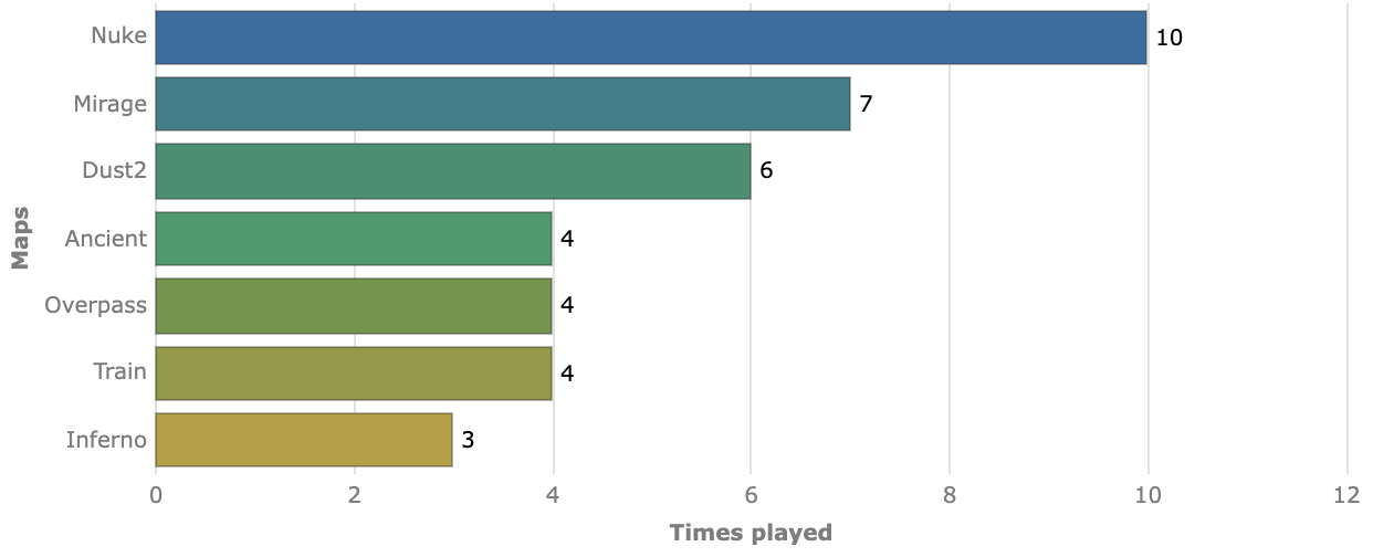 В топ-3 самых популярных карт ивента вошли Mirage и Dust2 – команды провели на них семь и шесть игр соответственно. В первую пятерку также попали Ancient, Overpass и Train (по 4 игры).