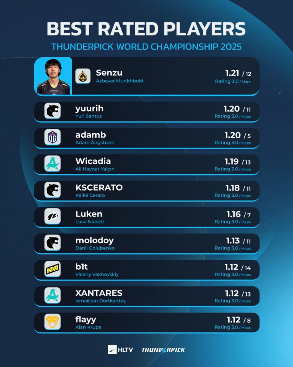 Участник состава The MongolZ Мюнхболдын "Senzu" Азбаяр финишировал минувший чемпионат Thunderpick World Championship 2025 по Counter-Strike 2 с самым высоким рейтингом среди всех участников соревнования – 1.21 за 12 карт.