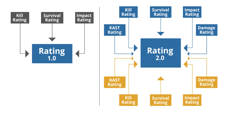 В то время как другие проекты публиковали лишь счет и результаты матчей, HLTV начал более детально углубляться в итоги встречи, постепенно модифицируя рейтинг от версии 1.0 до уже существующей системы Rating 3.0. Если первая версия была больше похожа на итоговое K/D игрока, за что подвергалась значительной критике в комьюнити, то вторая начала включать в себя ряд дополнительных заслуг в матче, таких как KAST, ADR и рейтинг воздействия. С выходом CS2 HLTV также адаптировали формулы под систему MR12, попутно повысив расчет до Rating 2.1, и лишь совсем недавно датский портал перешел на совсем иной уровень 3.0, введя уникальную метрику “round swing”, которая отражает влияние совершенных игроком киллов на победу в раунде.