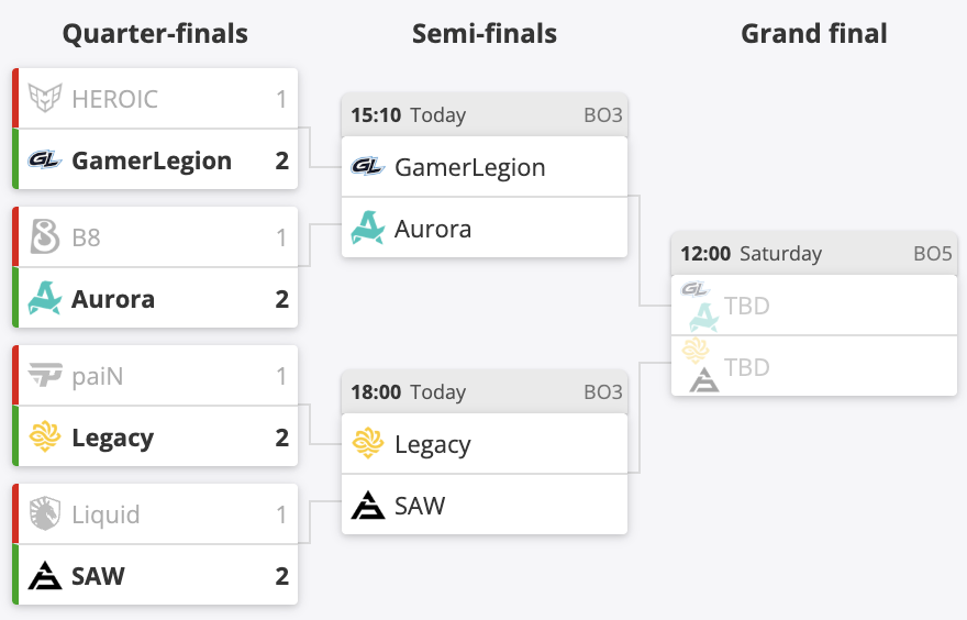В первом раунде турнирной сетки GamerLegion одержала победу над HEROIC (8:13 на Ancient, 13:6 на Dust2, 13:7 на Nuke), Aurora взяла верх над B8 (13:10 на Dust2, 8:13 на Mirage, 13:3 на Overpass), SAW обыграла Liquid (4:13 на Ancient, 13:2 на Train, 13:1 на Inferno), а Legacy оказалась сильнее paiN (13:7 на Inferno, 10:13 на Dust2, 13:7 на Nuke).