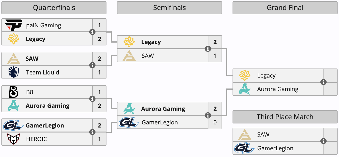 Во втором раунде турнирной сетки Aurora одержала победу над GamerLegion (13:1 на Overpass, 13:1 на Dust2), а Legacy оказалась сильнее SAW (7:13 на Inferno, 16:12 на Nuke, 13:3 на Ancient). Победители прошли в финал, который стартует 1 ноября в 14:00 по московскому времени и пройдет до трех побед. Проигравшие, в свою очередь, завтра сыграют друг с другом матч за третье место.
