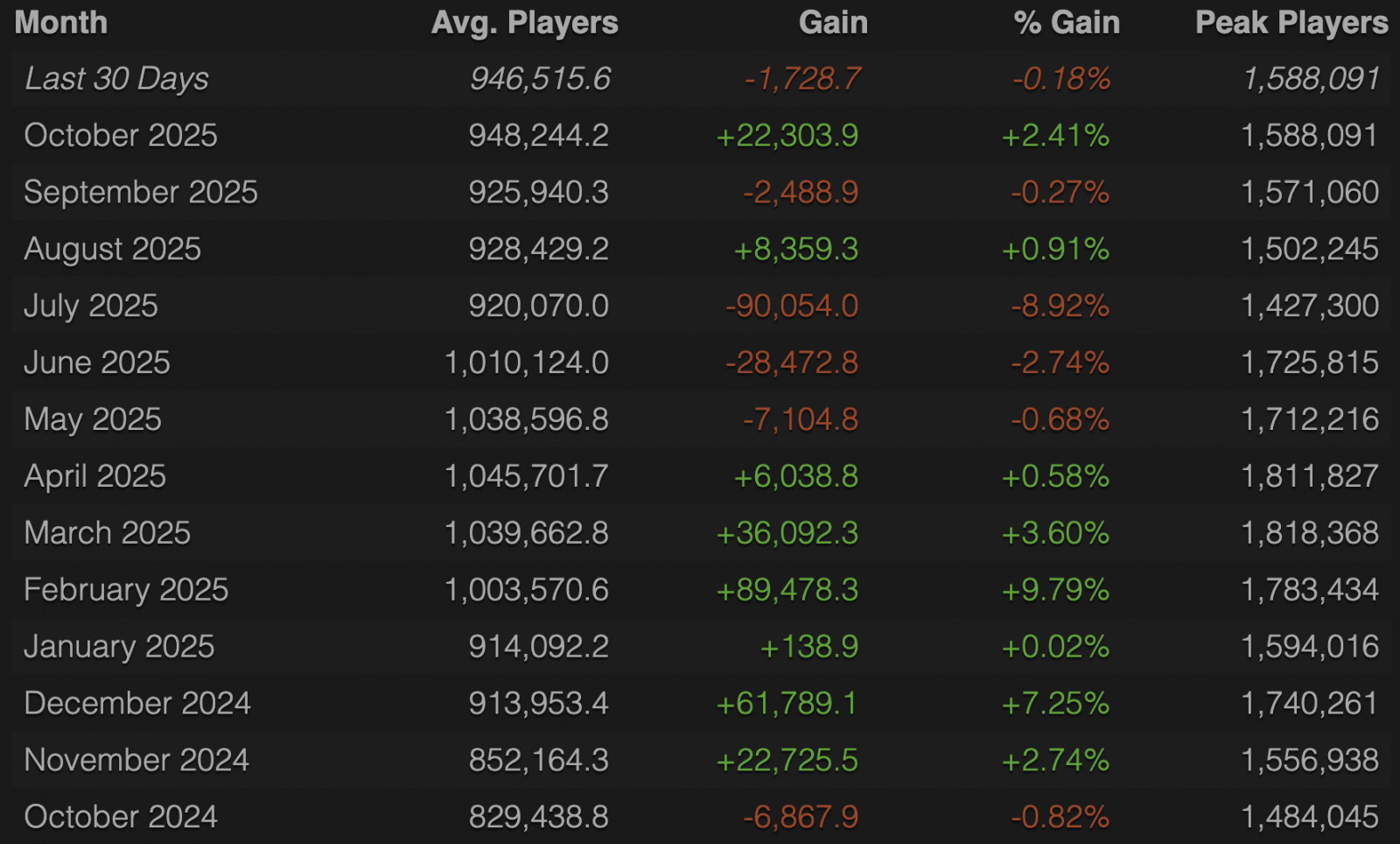 Среднемесячная аудитория Counter-Strike 2 незначительно увеличилась за последний месяц. В октябре 2025 года средний онлайн игры вырос на 2.41% (примерно 23 тысячи игроков) по отношению к предыдущему месяцу.