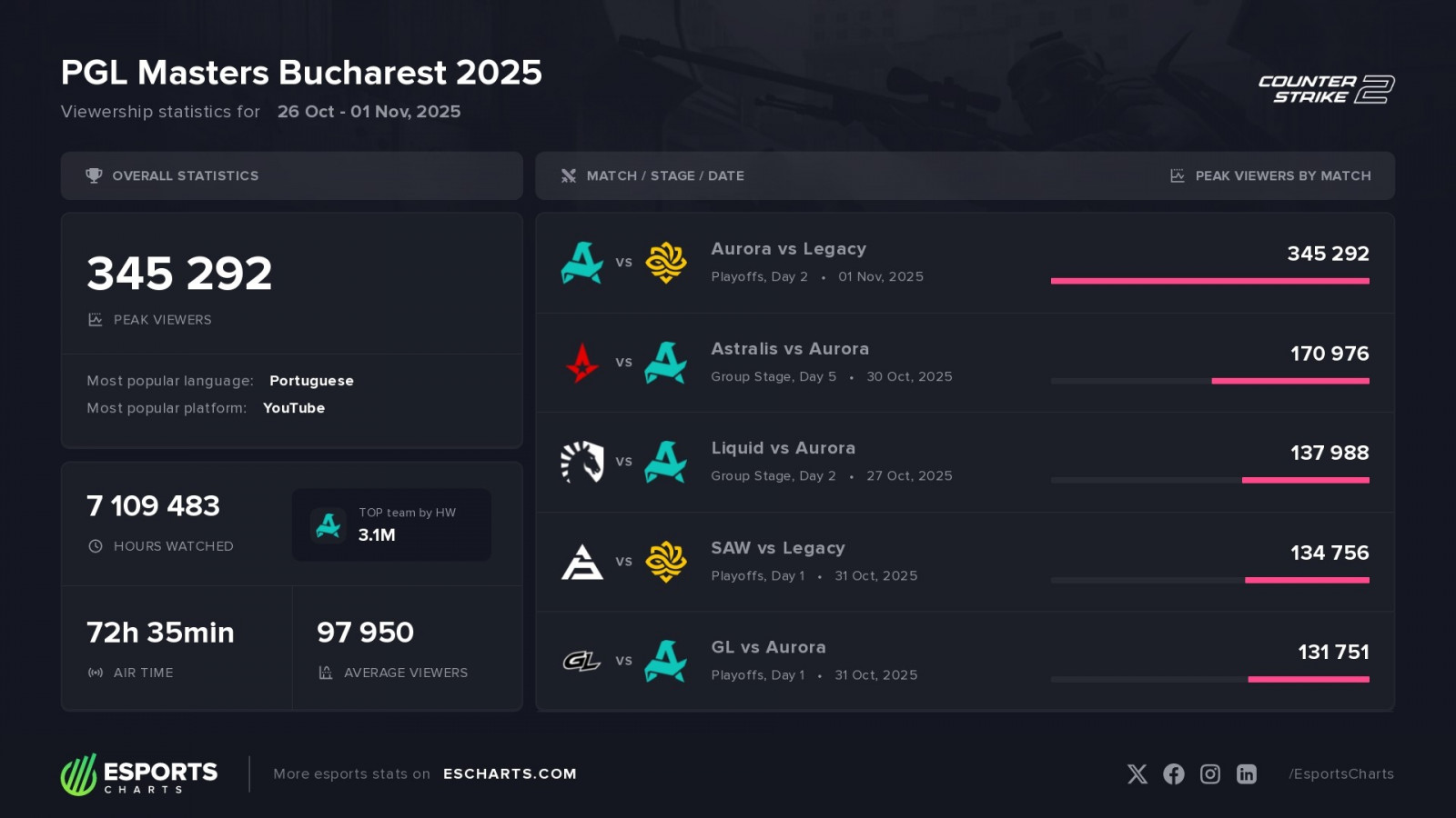 Самым популярным матчем ивента стал поединок между Aurora и Legacy в финале. В первую пятерку также вошли встречи с участием Astralis, SAW, GamerLegion и Liquid. Среднее количество зрителей на трансляциях составило 97 тысяч человек. Ивент провел в эфире 72 часа и набрал более 7.1 млн часов просмотра.