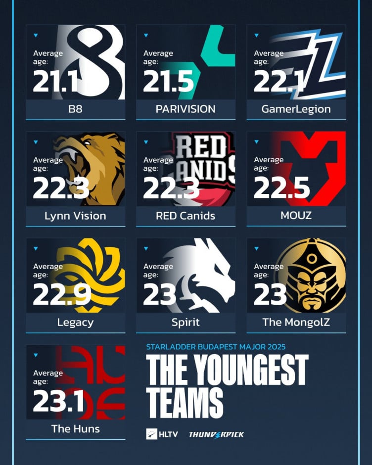 Самым молодым коллктивом на StarLadder Budapest Major 2025 стал B8 – средний возраст игроков украинской команды составляет 21.1 год. В первую тройку также входят PARIVISION (21.5) и GamerLegion (22.1). Статистикой поделился портал HLTV.org.