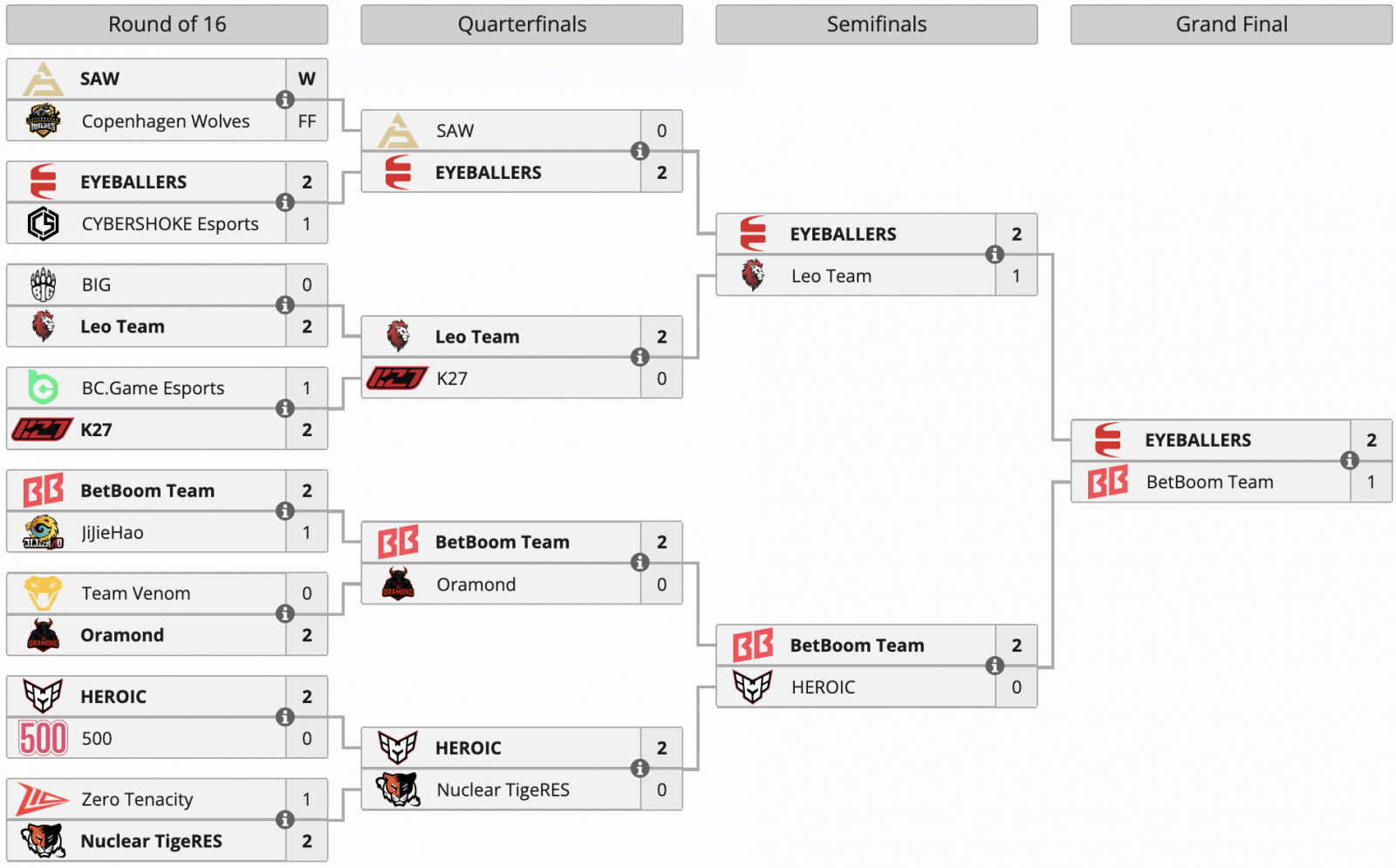 На пути в заключительный раунд турнирной сетки EYEBALLERS также расправилась с такими соперниками, как Leo, SAW и CYBERSHOKE.