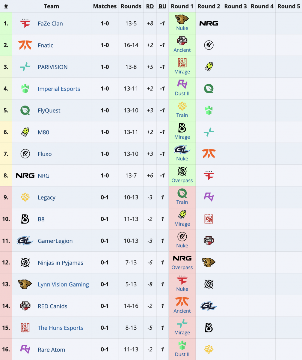 В рамках первого тура "швейцарки" M80 обыграла B8, Imperial взяла верх над Rare Atom, FlyQuest оказалась сильнее Legacy, PARIVISION одержала победу над The Huns, Fluxo одолела GamerLegion, NRG расправилась с NIP, FaZe превзошла Lynn Vision, а fnatic обыграла RED Canids. Все матчи были сыграны до одной победы.
