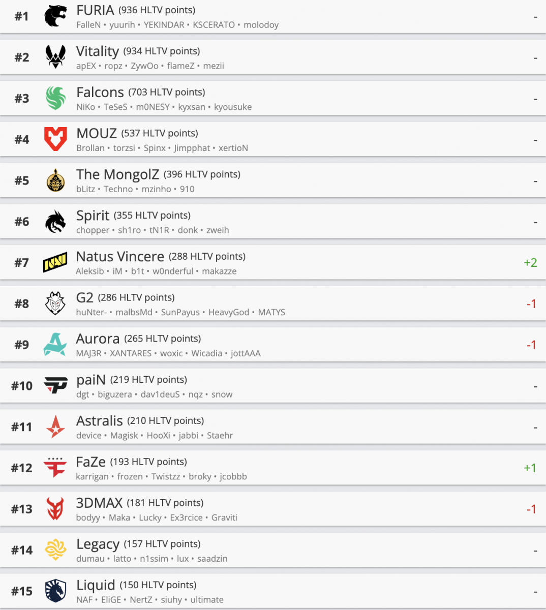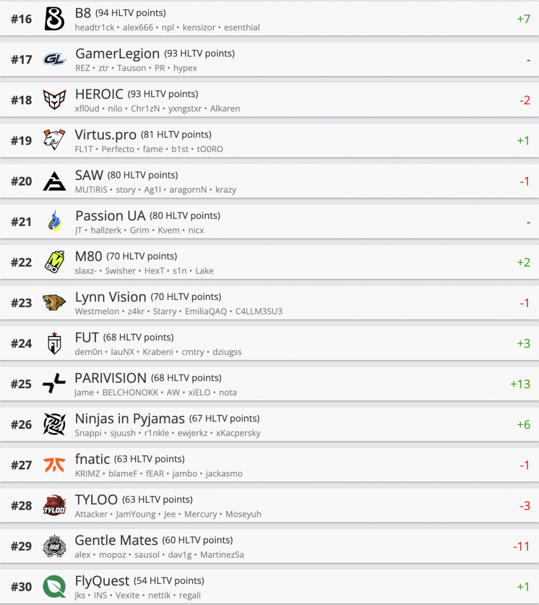 За прошедшую неделю прогресс показали еще несколько коллективов – Virtus.pro, M80, FUT, NIP, FlyQuest. Напротив, HEROIC, SAW, Lynn Vision и др. ухудшили свои позиции в рейтинге.