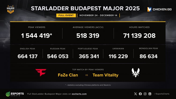 Минувший мейджор StarLadder Budapest Major 2025, который завершился победой Vitality, собрал на трансляциях 1.54 млн зрителей в пике. Статистикой поделился аналитический сервис Esports Charts.