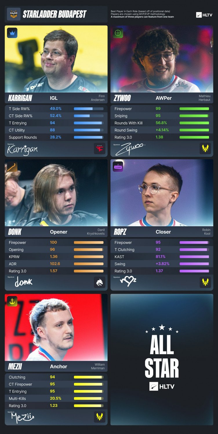 Кроме того, авторы HLTV представили символическую сборную лучших игроков StarLadder Budapest Major 2025 на каждой роли – в нее вошли по одному представителю Team Spirit и FaZe и три игрока Vitality.