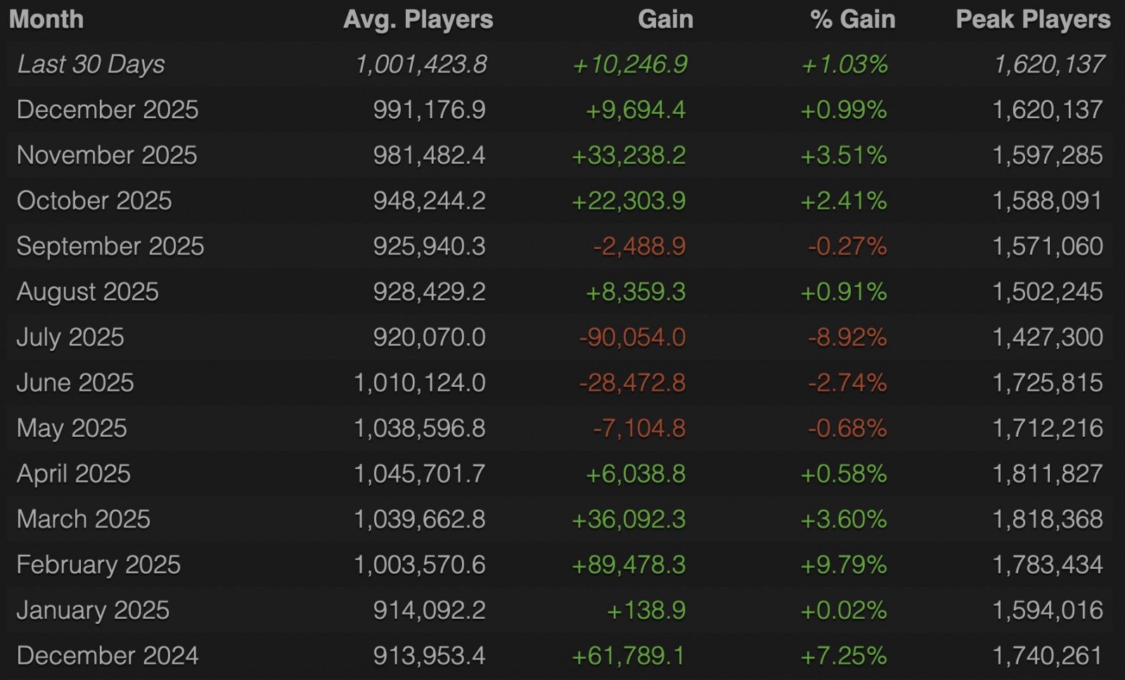 Среднемесячная аудитория Counter-Strike 2 увеличилась за последний месяц. В декабре 2025 года средний онлайн игры вырос на 0.99% (почти 10 тысяч игроков) по отношению к предыдущему месяцу.