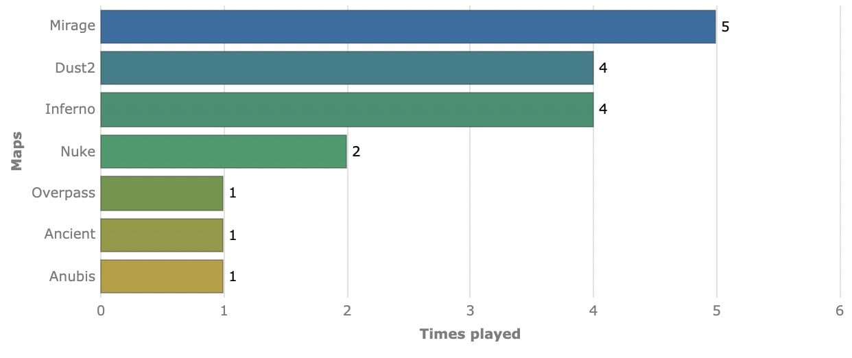 В топ-3 самых популярных карт ивента вошли Dust2 и Inferno – команды провели на них по четыре игры. В первую четверку также попала Nuke (2 игры).