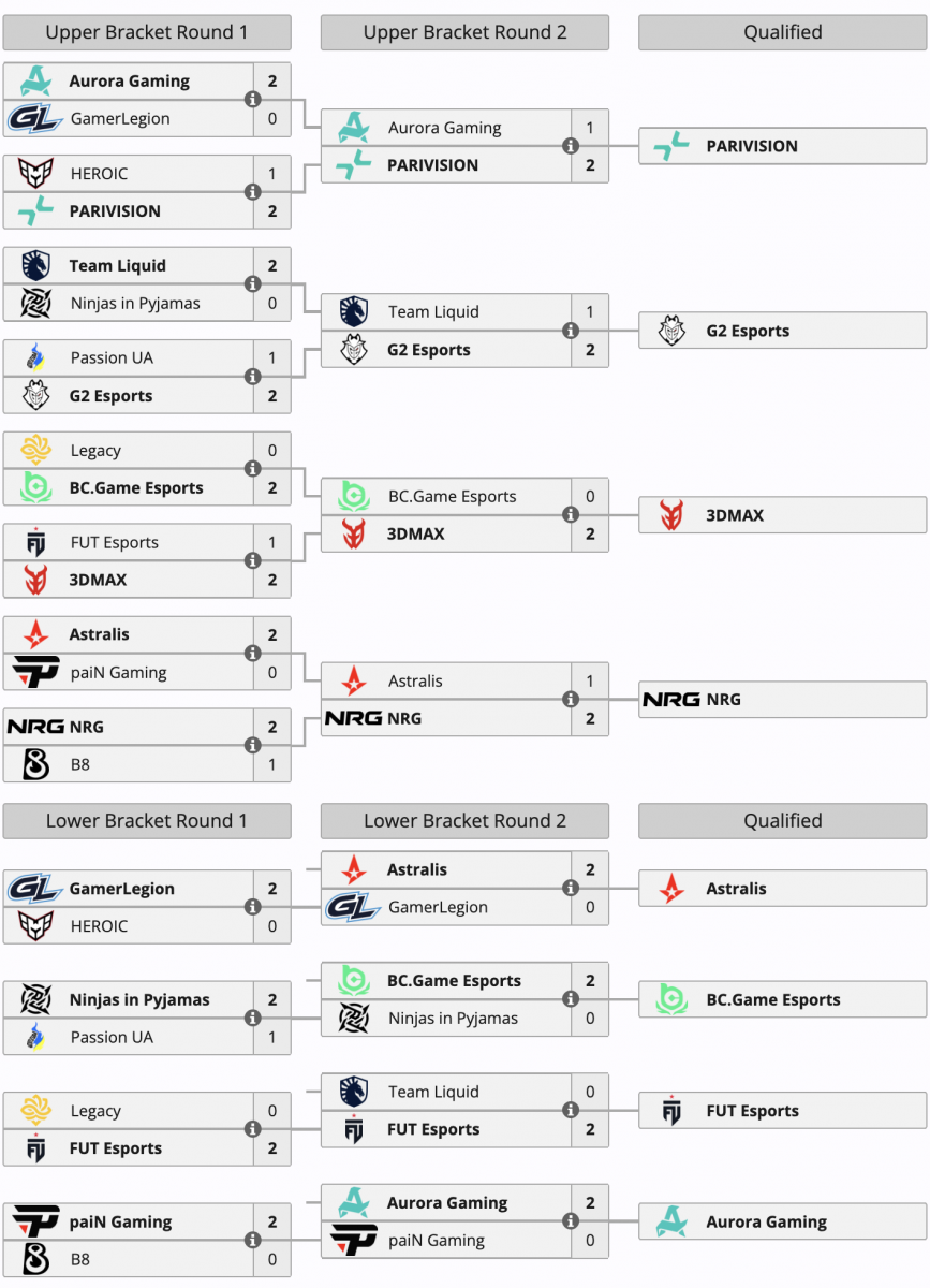 В верхней сетке NRG одержала победу над Astralis. В нижней сетке Astralis выбила из турнира GamerLegion, BC.Game обыграла NIP, FUT расправилась с Liquid, а Aurora взяла верх над paiN.