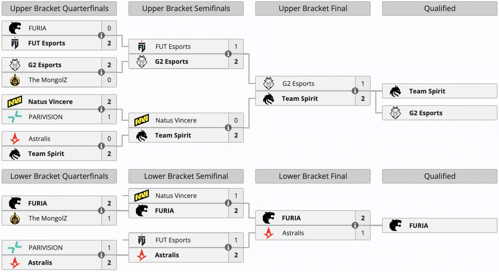 Кроме того, FURIA сегодня одержала победу над Astralis и обеспечила себя путевкой в заключительный этап мероприятия. Astralis, в свою очередь, покинула соревнование, заняв 7-8 место и заработав $24 тысячи призовых.