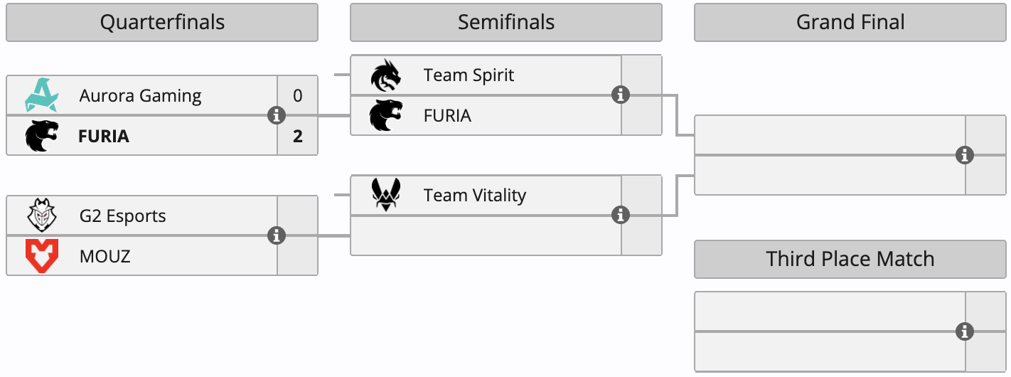 В первом раунде плей-офф команда Aurora со счетом 1:2 (7:13 на Dust2, 4:13 на Mirage) уступила FURIA и покинула соревнование.