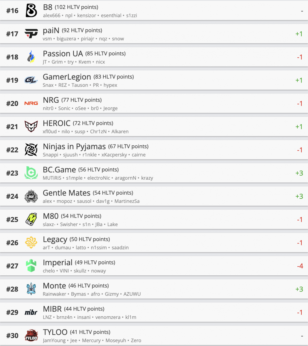 За прошедшую неделю прогресс показали еще несколько коллективов – paiN, GamerLegion и HEROIC. Напротив, Passion UA, NRG, NIP и др. ухудшили свои позиции в рейтинге.