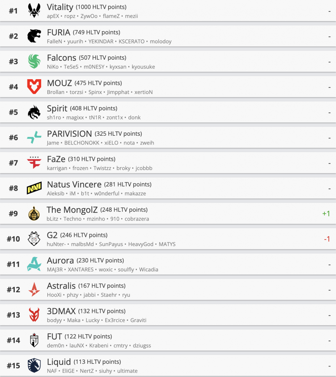 Портал HLTV.org представил обновленный рейтинг сильнейших команд мира по Counter-Strike 2. Состав The MongolZ поднялся в нем с десятой на девятую строчку, опередив G2.