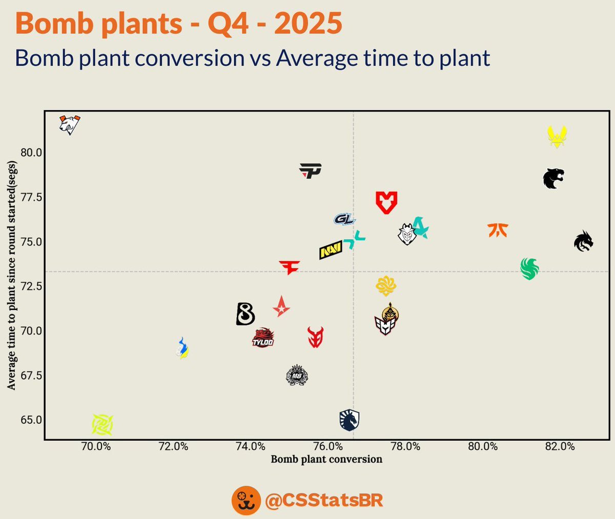 Здесь также стоит отметить, насколько сильно влияет фактор donk, позволяющий команде в сравнительно быстрый отрезок времени добраться до установки бомбы, сохраняя при этом высокий коэффициент результативности ввиду частых успешных энтри-фрагов, приводящих к доигровке раунда в большинстве. Тем временем молниеносные выходы на точку в исполнении NIP работают лишь в 70% случаев, располагая их примерно на одной строчке с Virtus.pro по данному параметру.