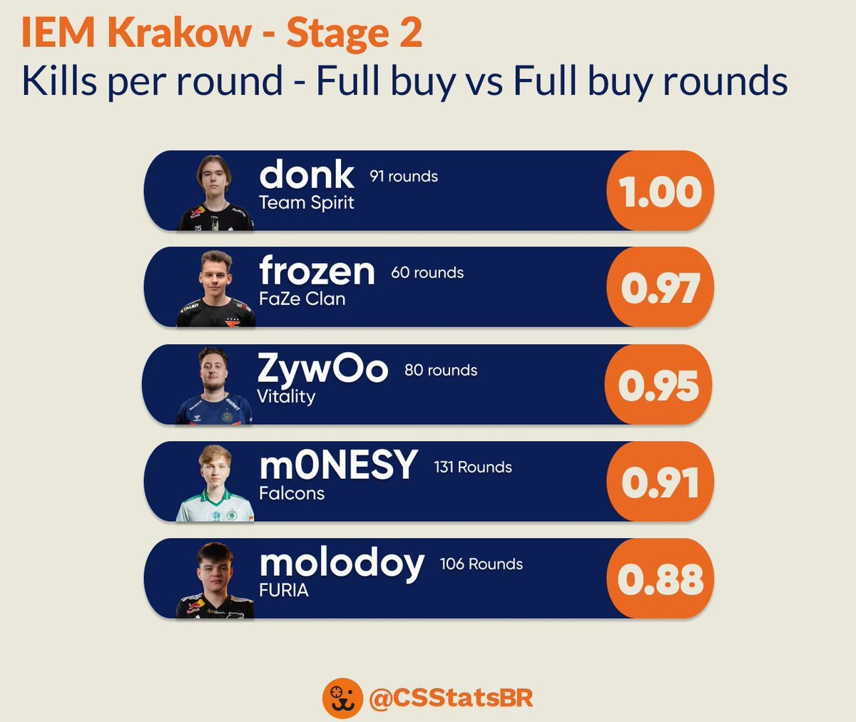 Примечательно, что высоким показателем KPR чаще обладают именно снайперы, учитывая специфику их основного оружия. На этом фоне видеть в данном списке ZywOo, m0NESY и molodoy уж точно не удивительно, однако энтри-фрагеры все же появляются здесь гораздо реже. Таким образом, можно с уверенностью сказать, что на старте этого сезона donk & frozen обрели статус лучших стрелков, до которых остальным рифлерам будет крайне тяжело добраться.