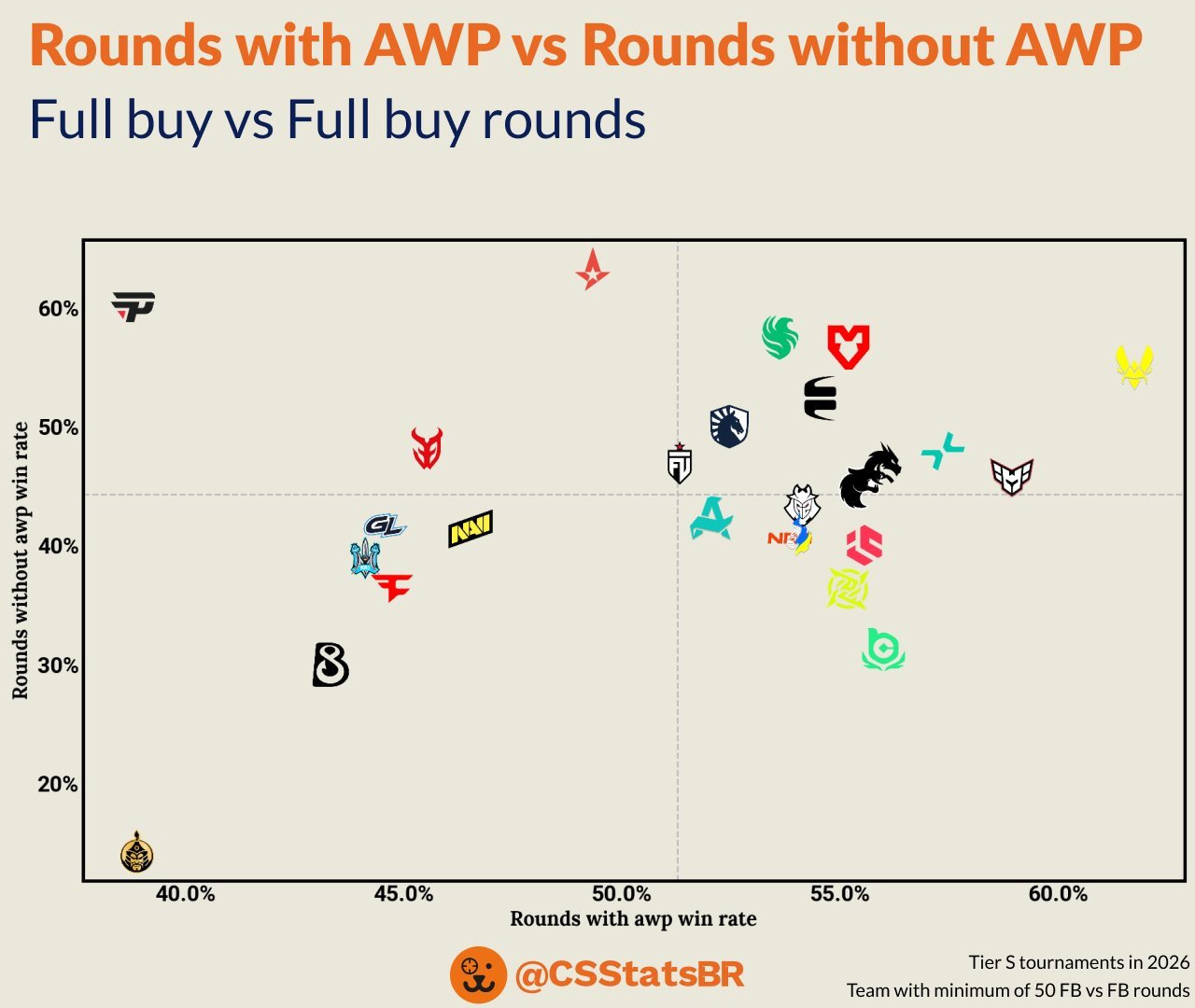 The MongolZ стоит также обратить внимание на данную статистику, из которой следует, что коллектив испытывает колоссальные проблемы при отсутствии нужного девайса для 910. В Кракове команда достигла низшего показателя винрейта в ситуациях без AWP, при этом имея огромный отрицательный разрыв от ближайшего коллектива по данному показателю. Тем не менее существуют и обратные истории: команде paiN лучше не брать винтовку, поскольку винрейт без нее возрастает практически на ~22 пункта. В свою очередь, Astralis обрели уникальное достижение, которое позволяет им вовсе не покупать столь дорогой девайс для того, чтобы выигрывать раунды. На IEM Krakow 2026 все получалось как с ним, так и без него. График также в очередной раз доказывает, что ZywOo является лучшим снайпером в текущей расстановке сил, поскольку именно Vitality стали командой с наивысшим показателем по винрейту в раундах с наличием AWP. Однако при этом Матье все еще остается гибридным игроком, способным помогать своей команде и в роли рифлера.