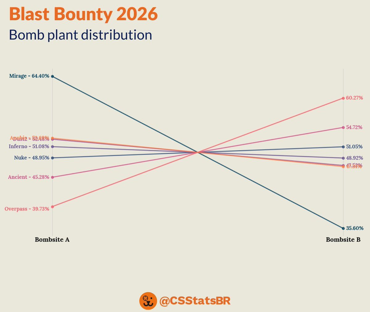 Следующий пункт, на который обратили внимание в новом сезоне, – пленты, в частности, их популярность на конкретных картах. Как выяснилось, самым превалирующим вариантом в рамках BLAST Bounty 2026 Season 1 оказалась точка “A” на Mirage с отрывом практически в 30% от своего конкурента. Почти равную тенденцию смогли показать лишь четыре из семи карт соревновательного пула: Anubis, Dust2, Inferno, Nuke. Остальные же достигли перевеса около 5 и более процентов по популярности плентов.