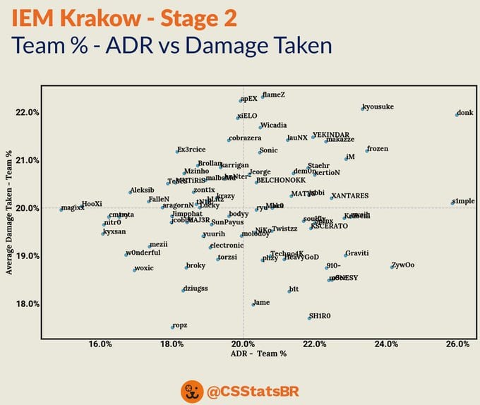 Average Damage per Round (средний нанесённый урон за раунд) – один из важнейших показателей, характеризующих огневую мощь конкретного игрока. Однако стоит посмотреть на эту статистику сквозь призму не индивидуального, а командного аспекта, беря в учет, какая конкретно доля от нанесенного урона принадлежит тому или иному игроку. В идеальной среде все просто: на каждого члена команды в среднем должно приходиться по 20% на показатель, и если ADR > 20%, а полученный урон < 20%, то игрока смело можно назвать практически идеальным. Однако на деле все складывается совсем иначе, поскольку зачастую варьируется не только от индивидуального мастерства игрока, но и от его роли. И именно этот показатель может наглядно объяснить, насколько хорош игрок на своей позиции.