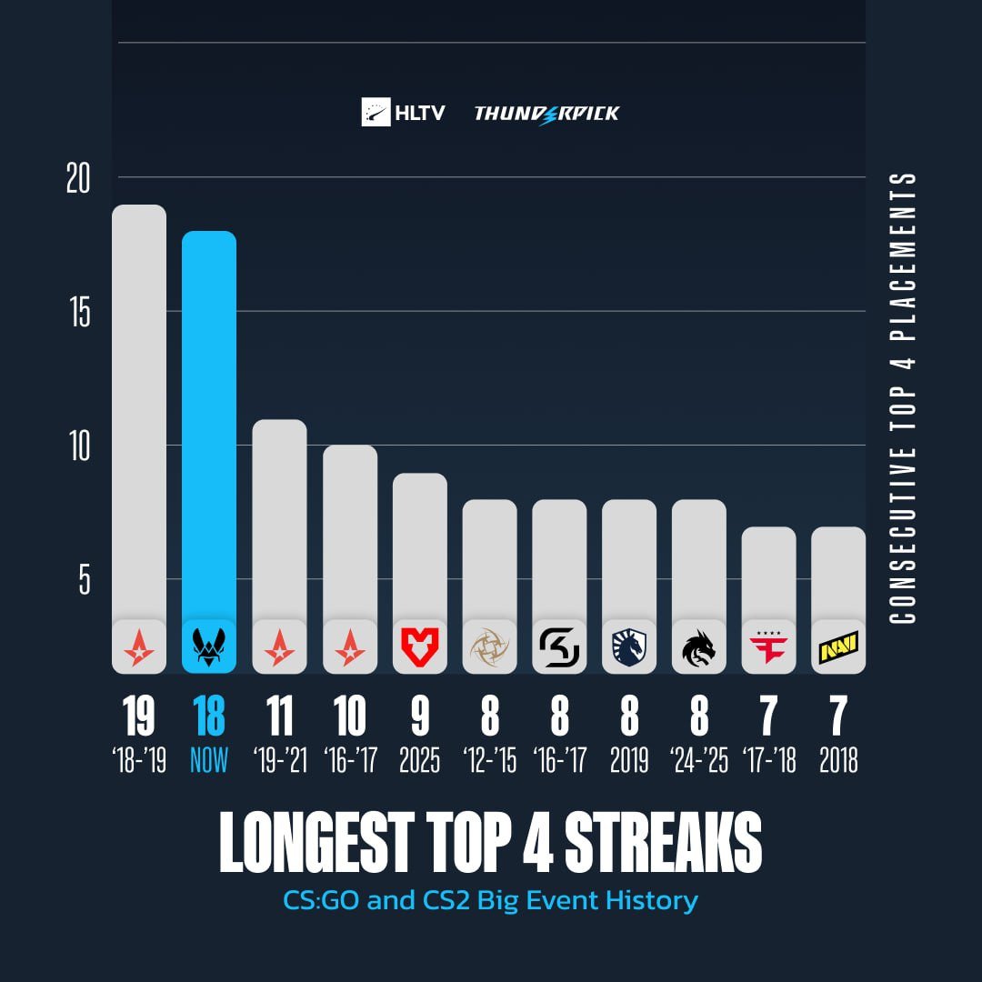 Рекордсменом по этому показателю по-прежнему является Astralis: в 2018-2019 годах команда прошла в топ-4 на 19 крупных турнирах подряд. Таким образом, уже на BLAST Open Rotterdam 2026 французский коллектив получит возможность догнать рекордсмена.
