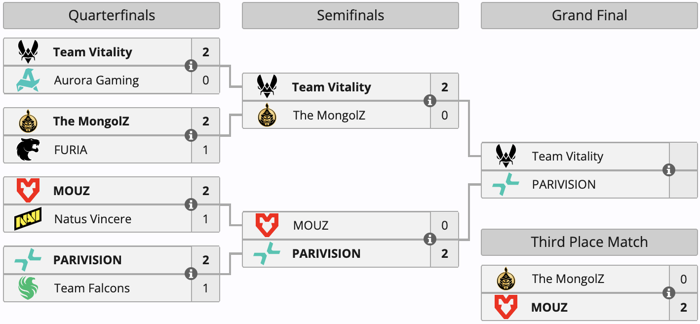 Таким образом, Brollan и его тиммейты заработали $68 750 призовых, а выигрыш The MongolZ за четвертое место составил $43 750. Напомним, что в полуфинале турнира MOUZ уступила PARIVISION, а The MongolZ не справилась с Vitality.
