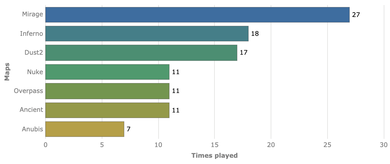 В топ-3 самых популярных карт ивента вошли Inferno и Dust2 – команды провели на них 18 и 17 игр соответственно. В первую шестерку также попали Nuke, Overpass и Ancient (по 11 игр на каждой).