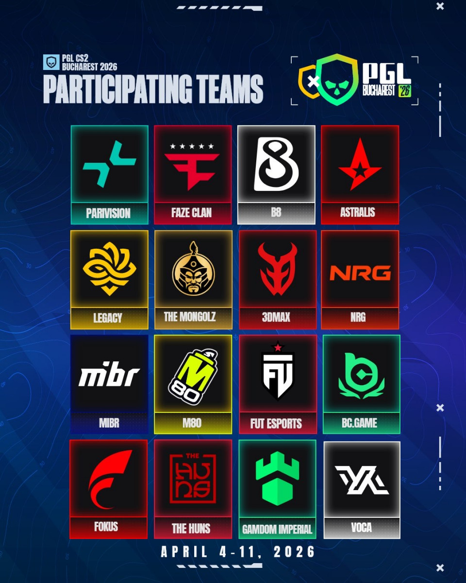 PGL Bucharest 2026 пройдет с 4 по 11 апреля 2026 года в студии PGL в Бухаресте, Румыния. Призовой фонд ивента составит 625 тысяч долларов США – его поделят между собой 16 коллективов. Полный список участников выглядит следующим образом: