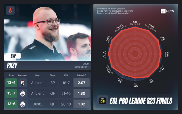 Портал HLTV.org опубликовал список киберспортсменов, удостоенных звания исключительно ценных игроков (EVP) по итогам минувшего чемпионата ESL Pro League Season 23 в Стокгольме.