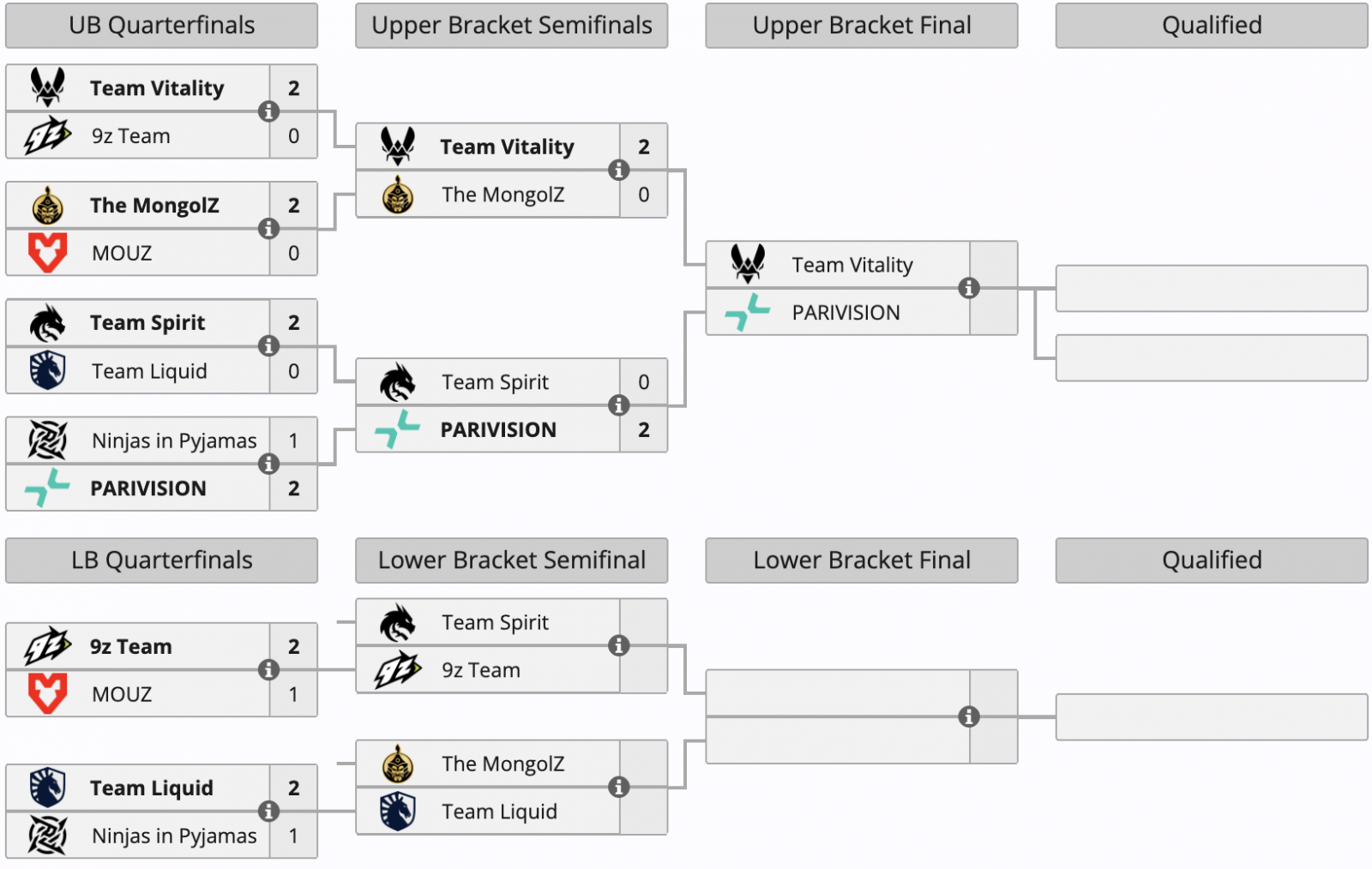 Во втором раунде верхней сетки группы B PARIVISION одержала победу над Team Spirit (13:3 на Anubis, 13:8 на Ancient), а Vitality оказалась сильнее The MongolZ (13:4 на Mirage, 16:13 на Overpass). Проигравшие коллективы упали в нижнюю сетку, а победители 23 марта встретятся друг с другом в матче за выход в полуфинал плей-офф (при этом обе команды уже гарантировали себе места в следующем этапе ивента).
