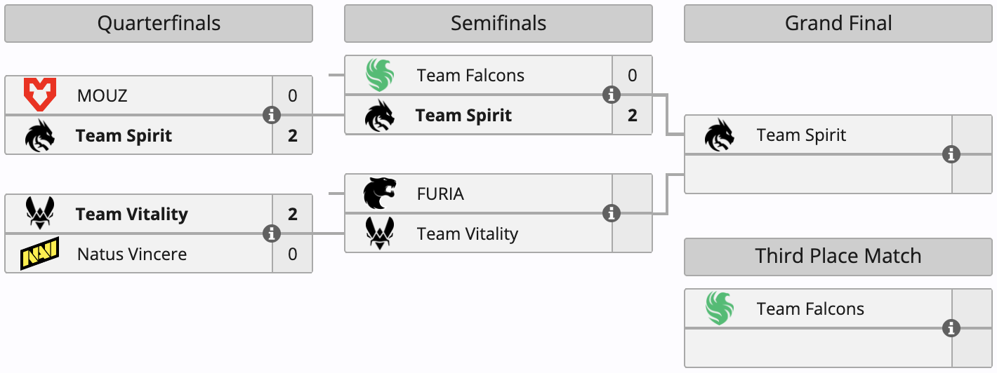 Завтра Team Spirit встретится с победителем противостояния Vitality – FURIA в матче за первое место на чемпионате. Falcons, в свою очередь, сыграет с проигравшим второго полуфинала поединок за третье место.