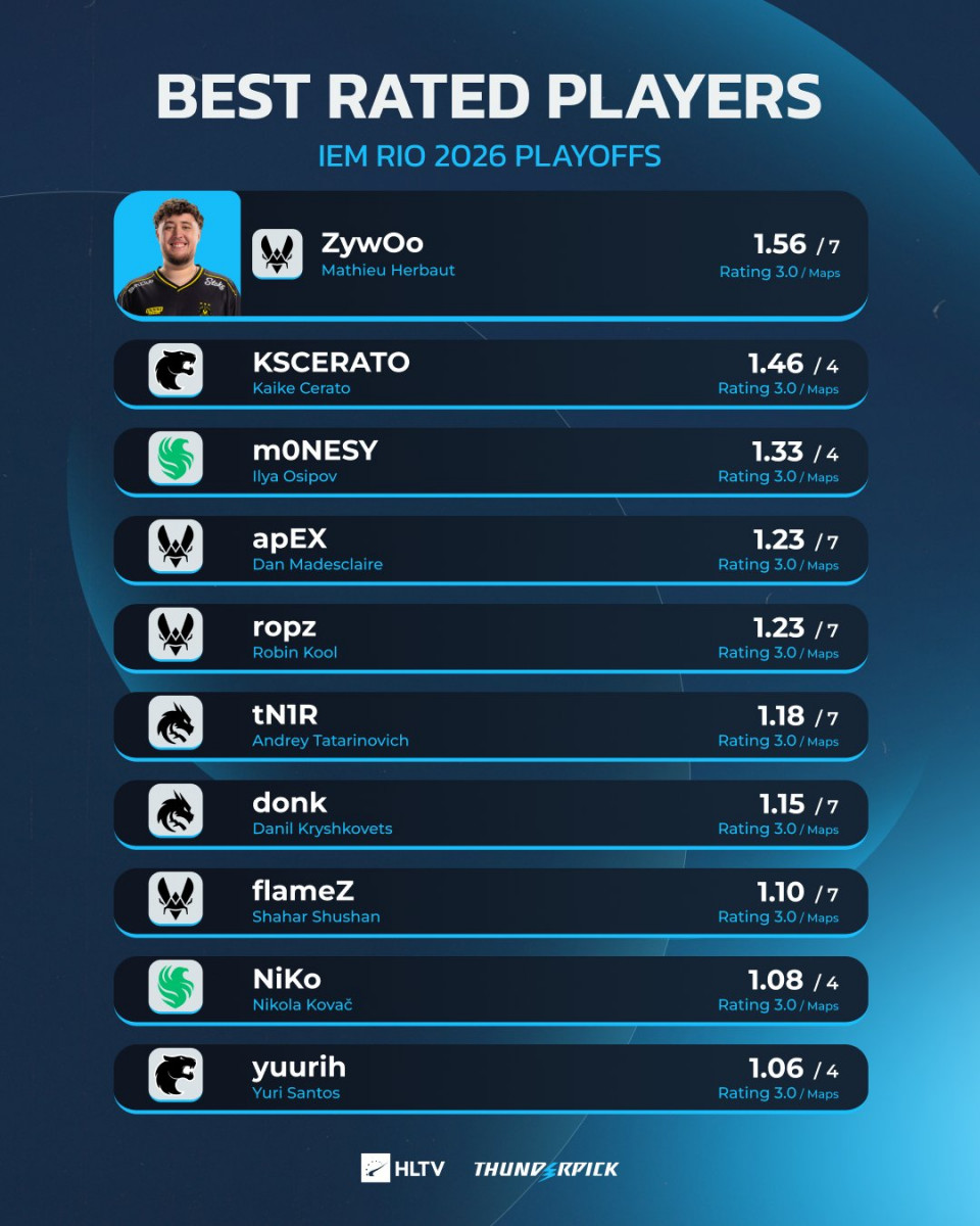 Снайпер состава Vitality Матье "ZywOo" Эрбо финишировал финальный этап минувшего чемпионата IEM Rio 2026 по Counter-Strike 2 с самым высоким рейтингом среди всех участников соревнования – 1.56 за 7 карт.